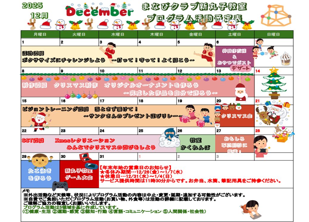 まなびクラブ新丸子教室の12月活動予定表が決まりました★ クリスマ...